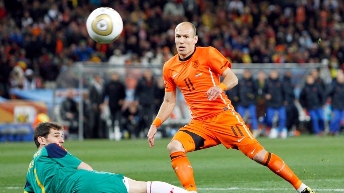 We worden er liever niet teveel aan herinnerd, de teen van Casillas, vandaag acht jaar geleden in de finale van het WK 2010. Na een prachtige pass van Sneijder ging Arjen Robben alleen op doelman Iker Casillas af. Hoe dat afliep is bekend.Arjen Robben zal er nog met regelmaat van wakker zijn geschoten, badend in het zweet. De teen van de doelman van de Spanjaarden voorkwam de goal en een 1-0 voorsprong van Oranje tegen Spanje in de 62e minuut van de WK-finale van 2010.Wat als...? Dat zal voor altijd de vraag blijven...