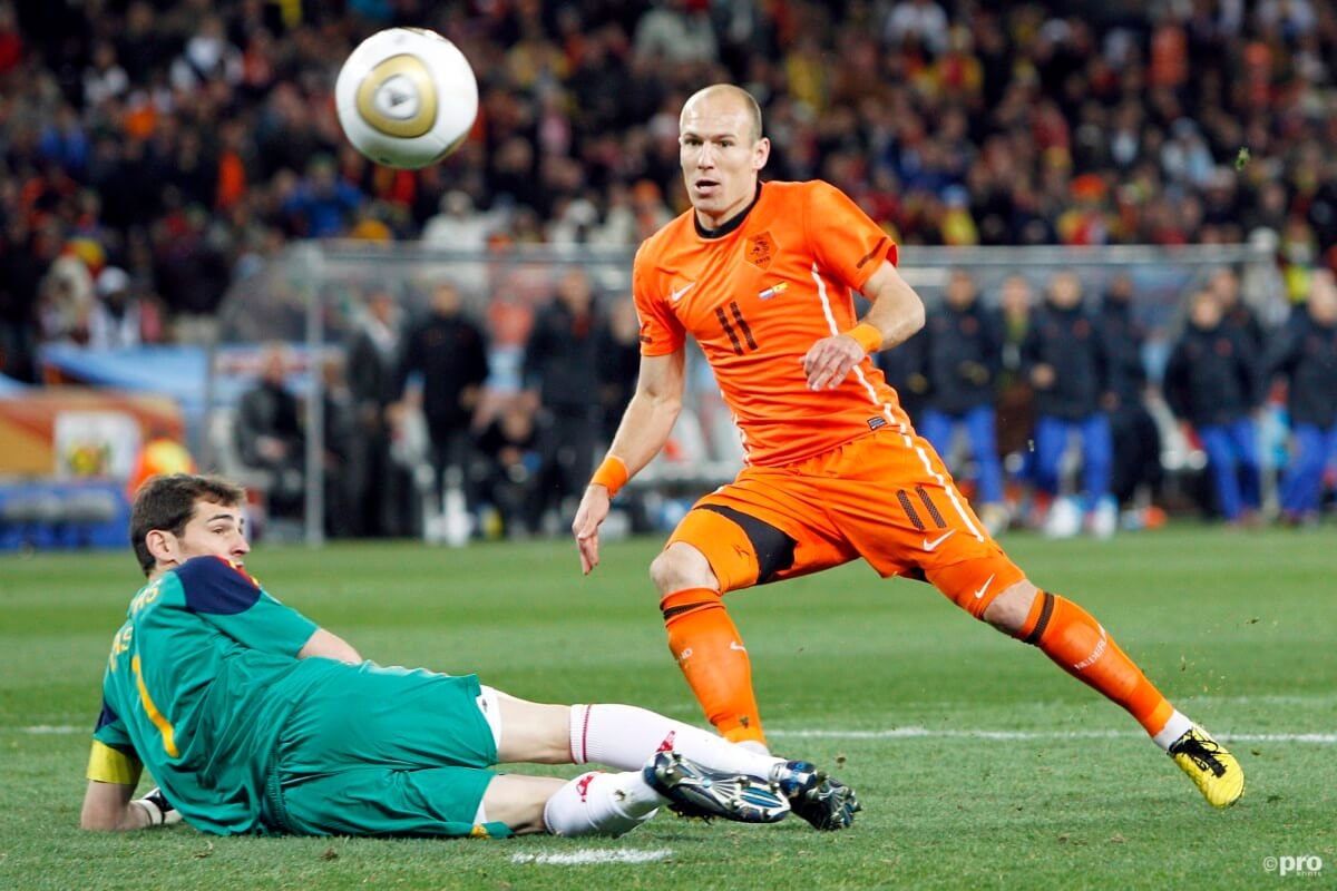 We worden er liever niet teveel aan herinnerd, de teen van Casillas, vandaag acht jaar geleden in de finale van het WK 2010. Na een prachtige pass van Sneijder ging Arjen Robben alleen op doelman Iker Casillas af. Hoe dat afliep is bekend.Arjen Robben zal er nog met regelmaat van wakker zijn geschoten, badend in het zweet. De teen van de doelman van de Spanjaarden voorkwam de goal en een 1-0 voorsprong van Oranje tegen Spanje in de 62e minuut van de WK-finale van 2010.Wat als...? Dat zal voor altijd de vraag blijven...
