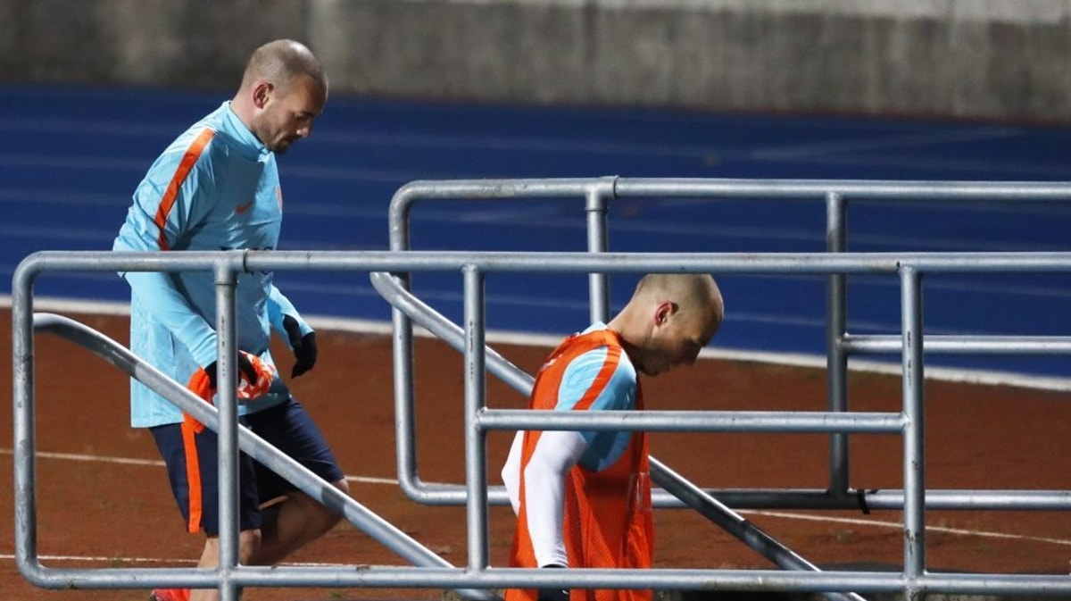 Een nieuwe tegenvaller voor bondscoach Danny Blind tijdens de rust van het WK-kwalificatieduel Luxemburg - Nederland. De bondscoach zag zijn twee routiniers Arjen Robben en Wesley Sneijder achterblijven in de kleedkamer. Met een ruststand van 1-1 is dat een flinke domper voor Blind, die vlak voor rust de Luxemburgers op 1-1 zag komen door een penalty.Arjen Robben maakte in de 36e minuut nog de 0-1 voor Oranje, maar raakte kort voor rust (opnieuw) geblesseerd. De rechtsbuiten was juist net teruggekeerd van een blessure maar moet nu opnieuw vanaf de kant toe gaan kijken.Ook Sneijder mistte de vorige interlands bij Oranje en was juist zo blij dat hij weer teruggekeerd was. De middenvelder, tegenwoordig vaak spelend als hangende linksbuiten, speelde vandaag zijn 126e interland voor Oranje.De twee ervaren rotten van Oranje werden vervangen door Steven Berghuis en Memphis Depay.