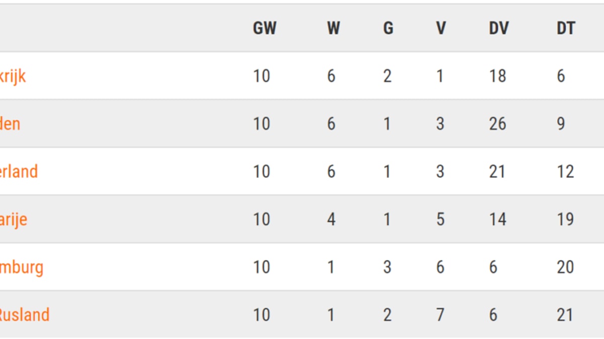 | Pos. | Land | GW | W | G | V | DV | DT | DS | Ptn |
