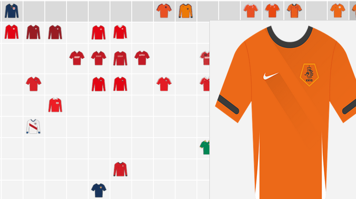 De bekende website Zalando heeft speciaal voor het WK voetbal het verloop van de internationale WK voetbalshirts, die sinds 1930 gedragen zijn, bij elkaar gezocht en in een mooi overzicht gezet. De landen waarvan de WK voetbalshirts zijn weergegeven, zijn alle 32 landen die in 2014 aanwezig zijn of waren op het wereldkampioenschap in Brazilië.In het onderstaande overzicht is mooi te zien hoe de shirts van alle landen veranderd zijn. Opvallend is dat de eerste WK voetbalshirts van het Nederlands Elftal blauw waren in plaats van het alom bekende oranje.Nederland deed in 1934 voor het eerste mee aan het WK voetbal en speelde toen dus in een blauw shirt met lange mouwen en een oranje touwtje bij de nek. Ook in 1938 werd dat shirt gedragen.Het eerste WK dat Oranje daarna meedeed was in 1974. In de finale tegen tegen West-Duitsland verloor Nederland, nu wel in Oranje shirt, met 2-1 van West-Duitsland.De tweede finaleplek werd behaald tegen Argentinië in 1978 en de derde keer finale was in 2010, toen team Oranje verloor van Spanje. Laten we hopen dat in de prachtige Oranje WK voetbalshirts van dit jaar, Nederland weer in de finale kunnen zien spelen!Zie hier alle WK-shirts van de deelnemers sinds 1930 (klik voor vergroting):