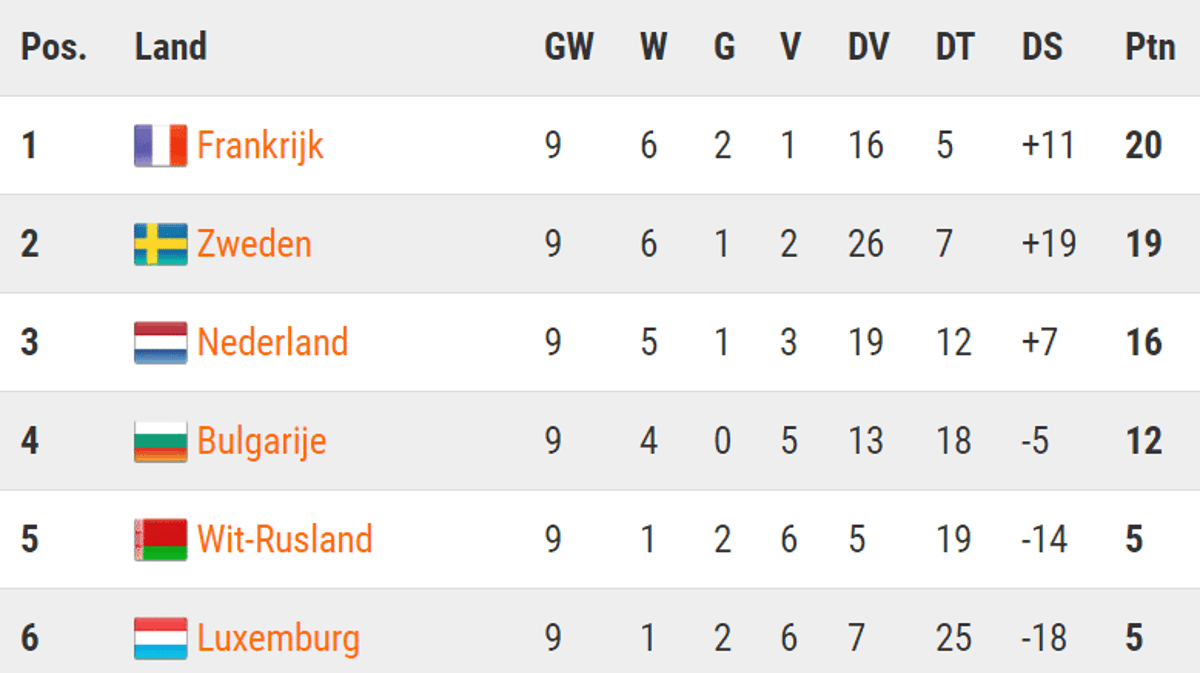 | 1 | Frankrijk | 9 | 6 | 2 | 1 | 16 | 5 | +11 | 20 |