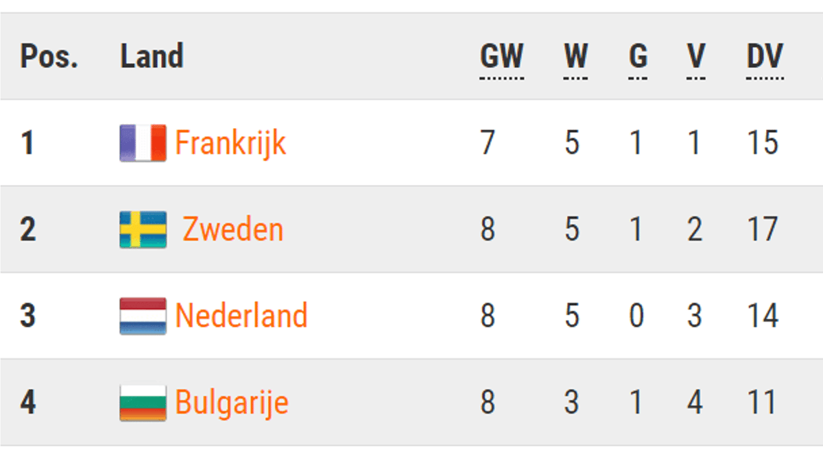 | 2 | Zweden | 8 | 5 | 1 | 2 | 17 | 7 | +10 | 16 |