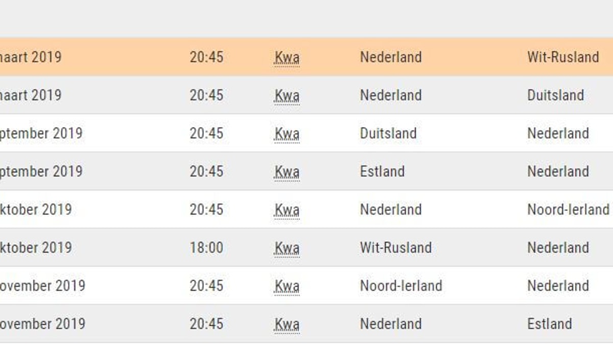 Na de loting van zondagmiddag heeft de UEFA ook de indeling van de wedstrijden van de EK-kwalificatie bekendgemaakt. Het Nederlands elftal speelt in de eerste drie duels al twee keer tegen grote concurrent Duitsland.De acht wedstrijden van het Nederlands elftal worden afgewerkt in maart, september, oktober en november 2019. In juni worden ook EK-kwalificatiewedstrijden gespeeld, maar omdat Oranje dan deelneemt aan de Final Four van de Nations League wordt er in de poule van Oranje dan niet gevoetbald.De laatste wedstrijd van Oranje is op 19 november 2019 het thuisduel met Estland. Daarna zal blijken of Oranje nog play-offs nodig heeft om zich te plaatsen of niet.Dit zijn de data van de acht kwalificatiewedstrijden van Oranje:Aanloop EK 2020donderdag 21 maart 2019, 20:45 uur: Nederland - Wit-Ruslandzondag 24 maart 2019, 20:45 uur: Nederland - Duitslandvrijdag 6 september 2019, 20:45 uur: Duitsland - Nederlandmaandag 9 september 2019, 20:45 uur: Estland - Nederlanddonderdag 10 oktober 2019, 20:45 uur:Nederland - Noord-Ierlandzondag 13 oktober 2019, 18:00uur:Wit-Rusland - Nederlandzaterdag 16 november 2019, 20:45 uur:Noord-Ierland - Nederlanddinsdag 19 november 2019, 20:45 uur: Nederland - Estland