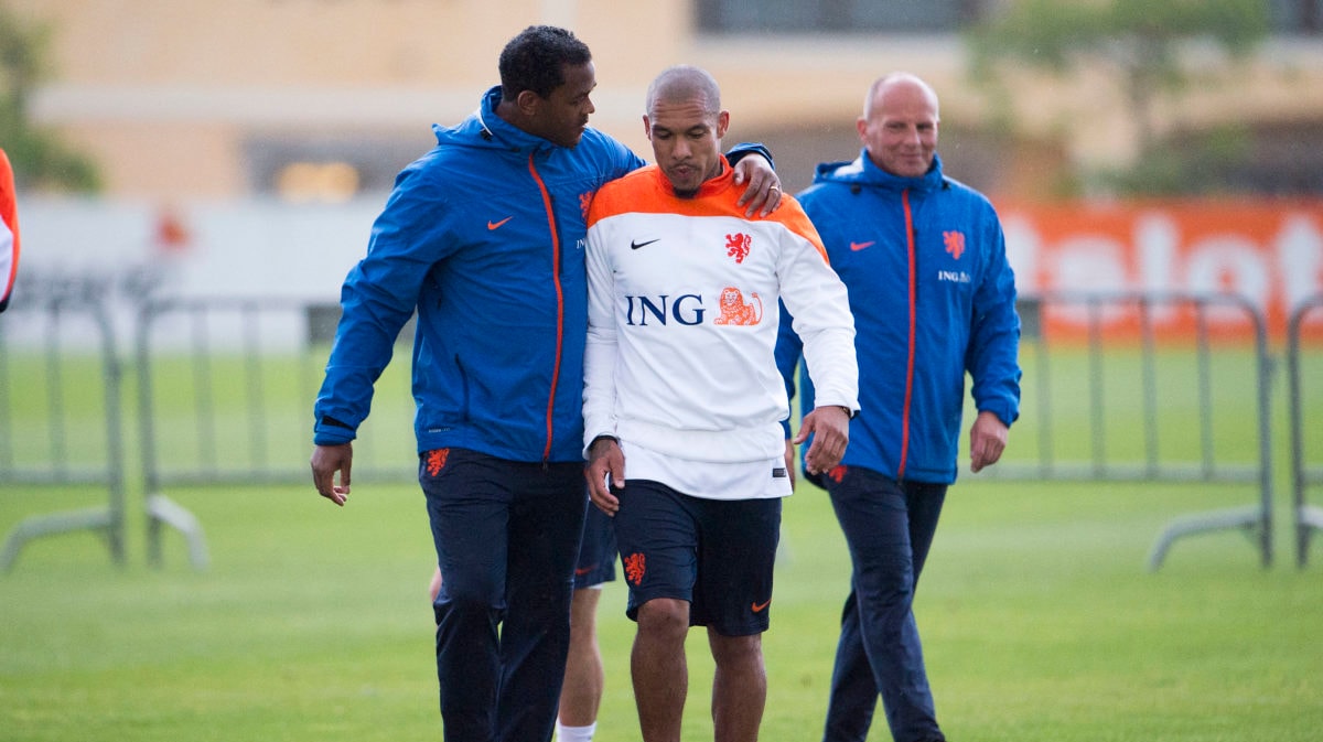 Hoe is het met Nigel de Jong? Dat is de vraag die heel Nederland bezighoudt na de met 2-1 gewonnen wedstrijd van Nederland tegen Mexico. Nigel de Jong viel uit met een liesblessure in het duel met Mexico en moet vrezen voor de rest van het WK.Van Gaal gaf na de wedstrijd een reactie op de blessure van de Jong, die volgens de bondscoach sowieso de kwartfinale moet missen, en wellicht nog meer: "Ik vrees dat het voorbij is voor Nigel de Jong", zei de bondscoach van het Nederlands elftal. "Maar ik wil niet voor mijn beurt spreken."Of hij dus nog mee kan doen is nog de vraag: Tegenover de NOS zei Van Gaal: "Het wordt lastig met De Jong, Van Persie is geen probleem."Laten we met z'n allen hopen dat De Jong dit WK nog in actie komt, wat zou betekenen dat we minimaal de halve finale gaan halen, en wie weet nog meer.