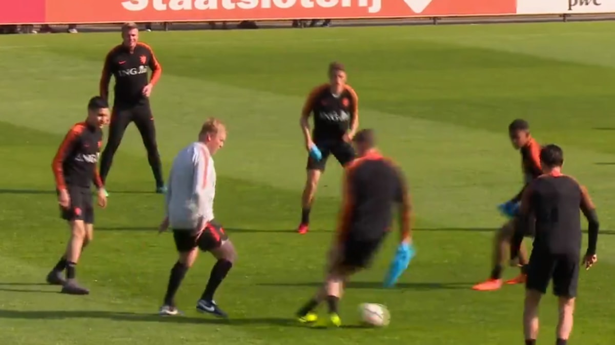 Een slecht momentje voor spits Wout Weghorst tijdens de eerste training van het Nederlands elftal vanmiddag.De aanvaller van AZ kreeg een gruwelijke panna van bondscoach Ronald Koeman. Tijdens een rondo die aan de start van de training werd gehouden stond de ongelukkige spits in het midden toen de bondscoach de bal heerlijke door de benen van de lange Weghorst speelde.Oranje traint vandaag en morgen met een aangepaste groep, komende week sluiten meer internationals aan in aanloop naar de duels met Slowakije en Italië.