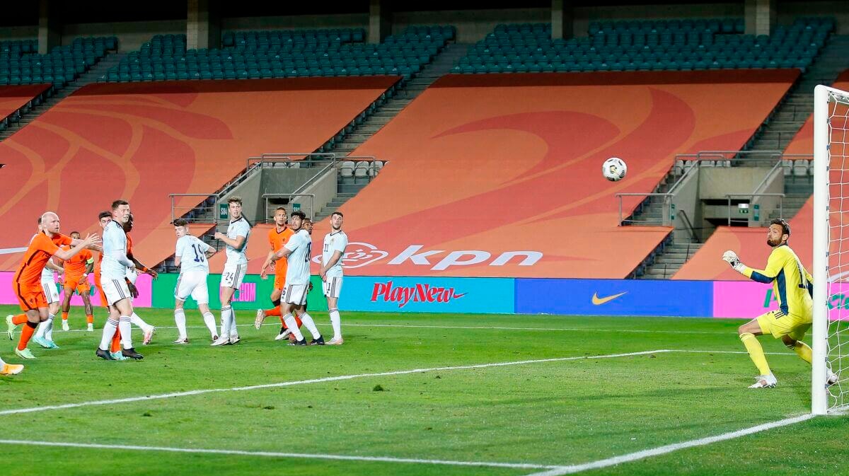 De spits van Oranje, die de aanvoerdersband in de 30e minuut overnam van de gewisselde Georginio Wijnaldum, schoot een vrije trap hard raak.