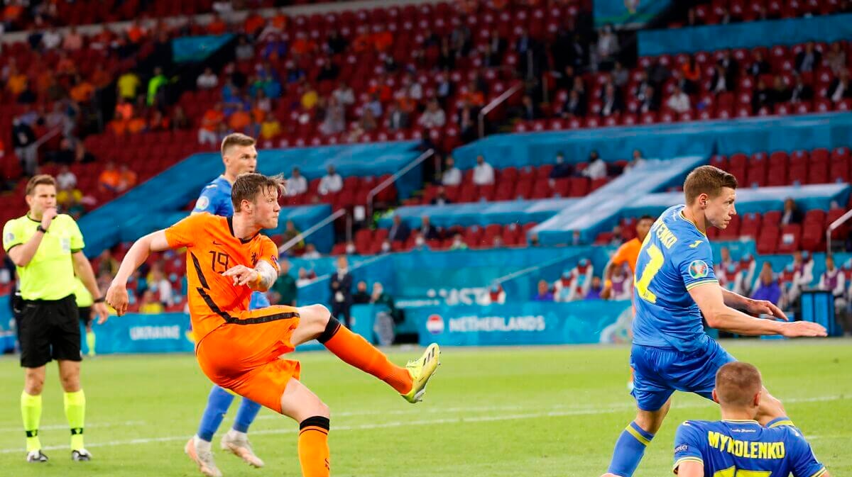 Het Nederlands elftal is goed aan het EK-voetbal begonnen met een verdiende 3-2 overwinning op Oekraïne. In een spektakelstuk wist Denzel Dumfries in het slot van de wedstrijd de winnende treffer aan het tekenen. De rechtsback kopte het Nederlands elftal enkele minuten voor tijd op een 3-2 voorsprong. Dit was nadat Oranje binnen enkele minuten een 2-0 voorsprong uit handen gaf. De PSV-verdediger maakte een geweldige indruk in het 5-3-2 systeem van bondscoach Frank de Boer. Dumfries noteerde de meeste balcontacten in het doelgebied van Oekraïne en was betrokken bij twee treffers.