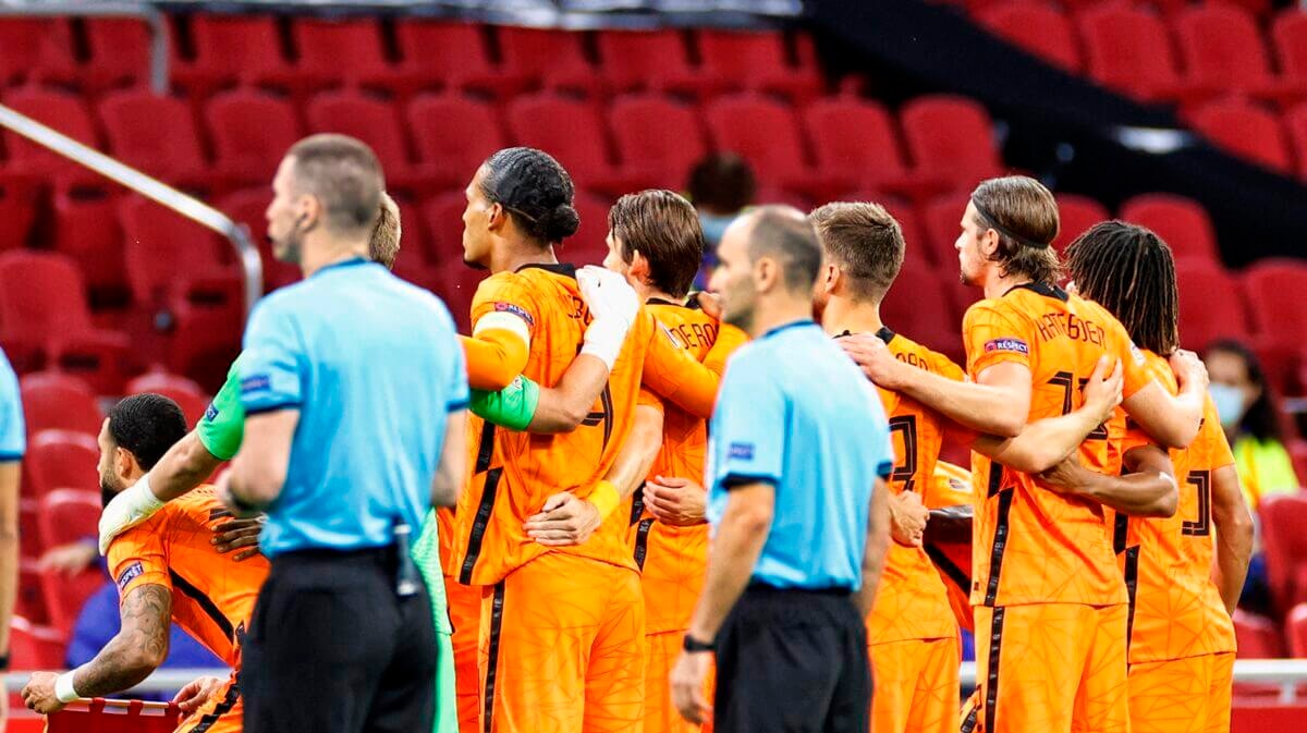 Achterin staan van rechts naar links Hans Hateboer, Stefan de Vrij, Virgil van Dijk en Owen Wijndal. De Vrij vervangt de geblesseerde Matthijs de Ligt en Hateboer krijgt de voorkeur boven Denzel Dumfries. AZ-debutant Owen Wijndal speelt in plaats van Daley Blind en Nathan Aké.