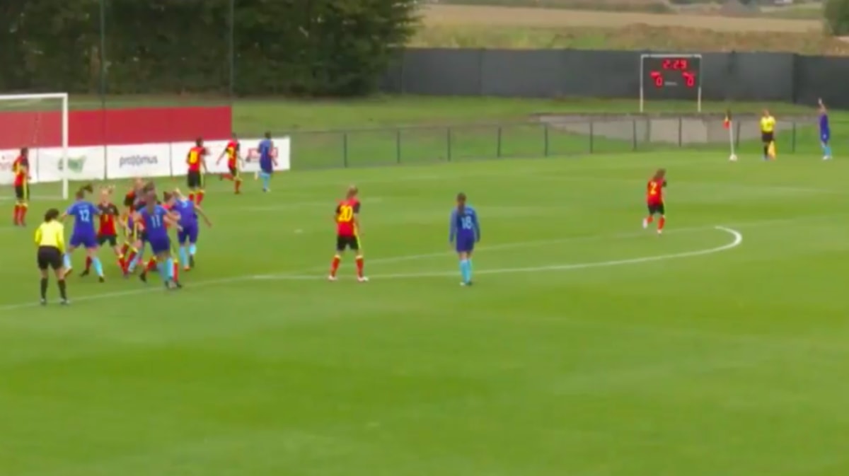 In de derde minuut komen de OranjeLeeuwinnen op voorsprong tegen België. Uit een hoekschop kopt Anouk Dekker de bal binnen.