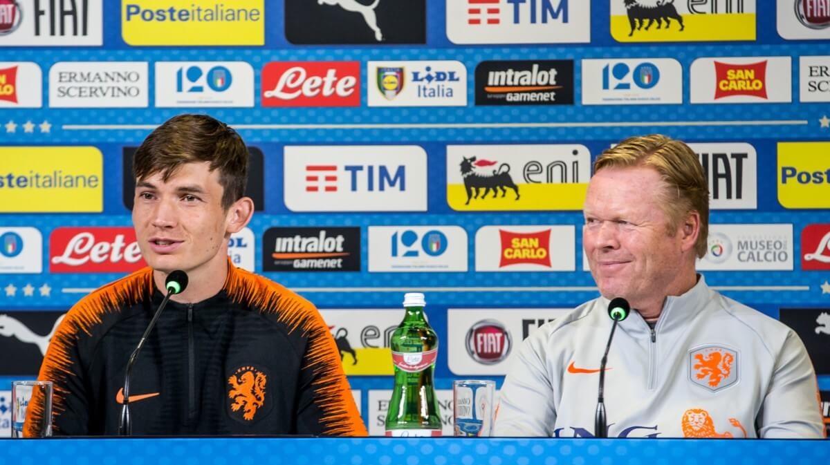 Het Nederlands elftal zal vanavond in het duel met Italië starten met Marten de Roon en Jasper Cillessen in de basis. Dat werd duidelijk aan de hand van de persconferentie voorafgaand aan het duel met de Italianen."We hebben de afspraak dat degene die naast ons zit, iemand is die start. Buiten dat hij de Italiaanse taal ook spreekt...", aldus Koeman, die met de Roon de persconferentie afwerkte. De Roon speelt sinds twee jaar bij Atalanta en is de Italiaanse taal dus langzaamaan steeds beter machtig.De Roon wist even daarvoor nog van niks: "Ik heb nog niks gehoord. Ik hoop natuurlijk wel dat ik speel, maar die vraag moet je aan Koeman stellen. Ik zou het zeker bijzonder vinden; een allereerste basisplek bij Oranje in Italië, waar ik nu twee jaar speel en het ontzettend naar mijn zin heb. Dat zou wel een heel mooie beloning zijn voor de afgelopen jaren."