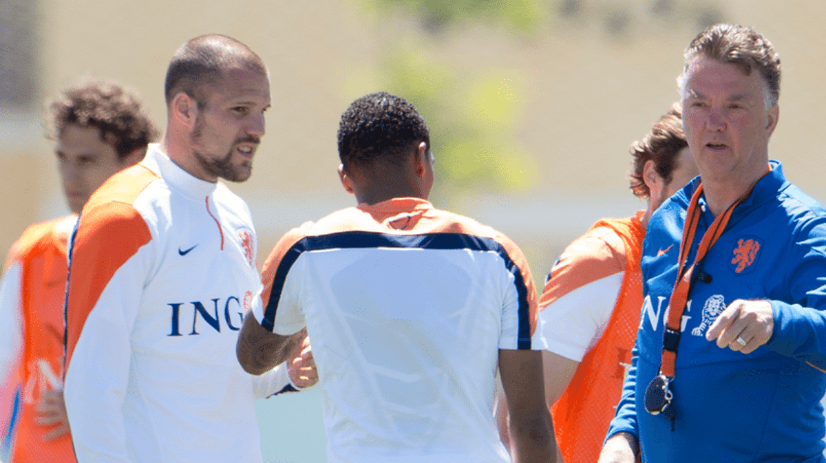 Bondscoach Louis van Gaal heeft het trainingskamp in het Portugese Lagos vooral gebruikt om zijn nieuwe systeem zo goed mogelijk in te slijpen. Hiervoor heeft hij veelal met een vast basisteam gewerkt. Tijdens de trainingen trainde Van Gaal vaak met 10 tegen 10, waarbij de vaste basis die hij als ideale opstelling ziet al vrij snel zichtbaar werd. Het nieuwe 1-5-3-2-systeem, of 1-3-4-3 zoals Van Gaal het noemt houdt in dat het bekende spel met vleugelspelers overboord gegooid is.Wij beschrijven het systeem hieronder als 1-5-3-2, met de noot dat de backs in dit systeem als middenvelders fungeren en nummer tien als derde aanvaller wordt gezien door Van Gaal.De eerste keeper van Oranje tijdens het WK lijkt Jasper Cillessen te worden. De Ajacied keepte telkens bij het beoogde basisteam en lijkt de strijd der keepers te hebben gewonnen. Welke andere twee keepers mee naar Brazilië gaan is nog niet zeker. Zoet, Vorm en Krul moeten strijden om die twee plaatsen.Zekerheid op rechtsback is Daryl Janmaat. Hij had even last van zijn enkel maar is weer fit en zal zeker in de basis staan. Centraal zal het drietal De Vrij, Vlaar en Martins Indi waarschijnlijk het hart vormen. De drie (ex)-Feyenoorders zullen het verdedigende trio moeten vormen. Als linksback kiest Van Gaal vermoedelijk vrij verrassend voor Daley Blind.Het middenveld bestaat uit de verdedigend ingesteld Nigel de Jong en Jonathan de Guzman. De speler van Swansea City en vechter van AC Milan zullen nummer tien Wesley Sneijder moeten ontlasten in zijn verdedigende taken. Voor Sneijder is de belangrijke rol weggelegd als spelverdeler en verbindingsman tussen verdediging en aanval.Vooral zal het superduo Arjen Robben en Robin van Persie voor de doelpunten moeten gaan zorgen. De twee wereldtoppers zijn Nederlands hoop in bange dagen en moeten het de verdediging van Spanje, Australië en Chili lastig gaan maken. En wie weet welke verdedigers nog meer na de groepsfase..De vermoedelijke opstelling voor Nederland - Ghana:[caption id="attachment_13203" align="aligncenter" width="599"] De vermoedelijke opstelling tegen Ghana © meemetoranje.nl[/caption]