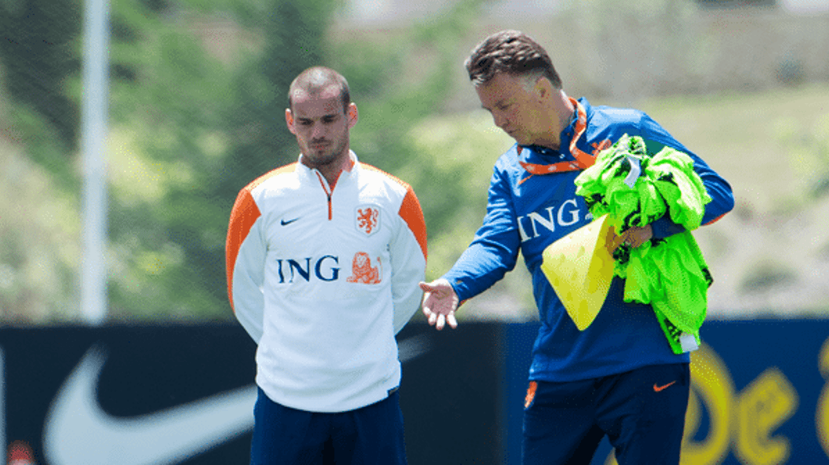 Louis van Gaal traint het nieuwe spelsysteem van het Nederlands elftal voorlopig met dezelfde spelers. De bondscoach van Oranje speelde vandaag tijdens de training in Lagos een partijvorm met dezelfde mogelijke basisopstelling als een dag eerder.Tijdens het positiespel van 10 tegen 10 speelden Paul Verhaegh, Stefan de Vrij, Ron Vlaar, Bruno Martins Indi, Patrick van Aanholt, Nigel de Jong, Wesley Sneijder, Daley Blind, Jeremain Lens en Robin van Persie in één team, net als een dag eerder.Van Gaal kon tijdens de training nog niet beschikken over aanvaller Arjen Robben en rechtsback Daryl Janmaat. Zij zullen vermoedelijk de plaatsen van Lens en Verhaegh overnemen als zij weer aansluiten. Van Gaal heeft nog ruim drie weken om zijn speelsysteem scherp te stellen. Op 13 juni is wereldkampioen Spanje in Salvador de eerste tegenstander van Oranje op het WK.