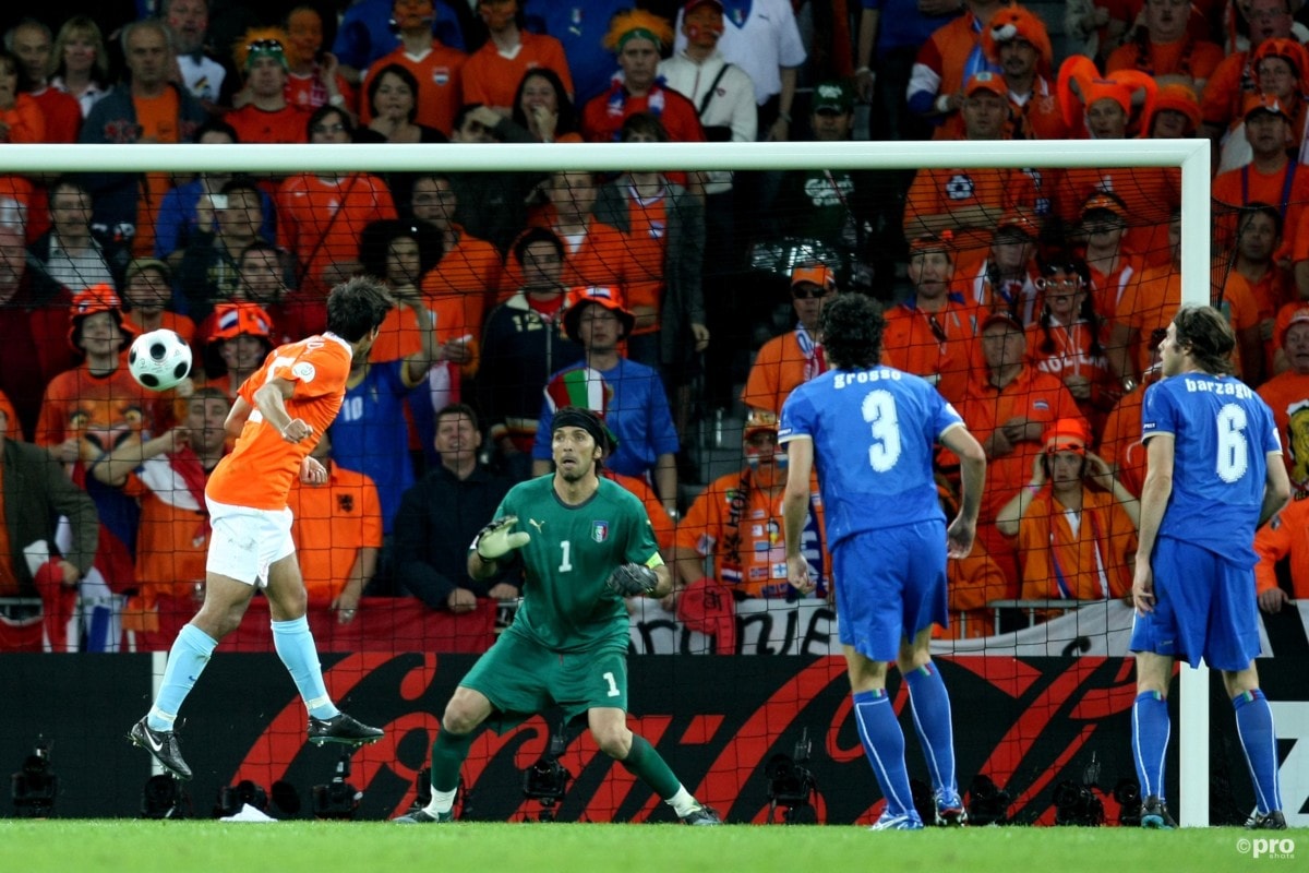 Voor de wedstrijd van toen gaan we terug naar 2008, toen Oranje zich wel plaatste voor het EK en met Italië, Frankrijk en Roemenië een loodzware poule trof. Omdat de WK finale van 2006 Frankrijk - Italië was hadden veel mensen weinig hoop op het bereiken van de kwartfinale. Bovendien was Roemenië ook niet de minste, omdat Nederland tijdens de kwalificaties er niet van wist te winnen.Op 9 juni was verbaasde Oranje echter de hele voetbalwereld in Stade de Suisse in Bern. In het duel met Italië was het al in de 26e minuut raak voor Nederland, Ruud van Nistelrooij opende de score. Een hard afvallend schot van Sneijder werd van richting veranderd door Van Nistelrooij en belandde in het doel 1-0. Vlak daarna een counteraanval van Nederland. Van Bronckhorst met de crosspass, het terugleggen van Kuijt en Sneijder met de volley, Bam! 2-0. Na rust zorgde Van der Sar voor wat belangrijke reddingen en maakte Giovanni van Bronckhorst met zijn hoofd het doelpunt dat de wedstrijd besliste, 3-0.Nederland won al zijn wedstrijden in de poule des doods, waar iedereen van te voren zo bang voor was. Met negen punten uit drie wedstrijden ging Nederland door. Helaas viel in de kwartfinale al het doek, want het Rusland van Guus Hiddink was te sterk na verlenging.Bekijk de beelden hier: