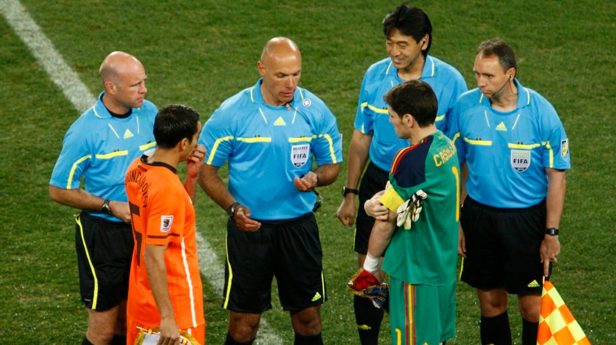 Het is de wedstrijd waar wij als Nederlandse voetbalfans het liefst niet aan herinnerd worden, de WK finale van 2010 tegen Spanje. In de biografie van scheidsrechter Howard Webb komt het duel echter aan bod, en daarmee ontkomen we er niet aan. Ook hij kijkt met afgrijzen terug op die avond in juli 2010.De arbiter van het duel beschrijft de finale als een nachtmerrie. Wat een van zijn mooiste wedstrijden ooit had moeten worden eindigde in een ramp: "Na twee minuten was er al een heel stevige tackle van Robin van Persie op Sergio Busquets", schrijft Webb in zijn boek. "Ik sprak hem erop aan. Ik kende hem wel uit zijn Arsenal-tijd en vond hem een oprechte jongen waar je makkelijk mee om kon gaan. Maar die avond was zijn houding duidelijk anders. Er kwam geen excuus of erkenning, hij was afwezig. O jee, werk aan de winkel, dacht ik."Uiteraard komt ook de karatetrap van Nigel de Jong aan bod, die Webb ontging en wat hem op veel kritiek kwam te staan: "Ik stond een kleine 10 meter achter Alonso, dus ik zag niet precies hoe De Jong hem had geraakt. Volgens mij was hij te laat en was het een roekeloze tackle. Ik besloot tot een gele kaart. Niemand van mijn team sprak mij in mijn oortje tegen.""Met mijn hand op mijn hart: een rode kaart is nooit bij mij opgekomen. Ik was op dat moment overtuigd van geel en niet geïntimideerd of onder druk gezet door de FIFA. Toen de Spanjaarden furieus reageerden, dacht ik dat het was omdat ik geen voordeel had gegeven. In de rust hoorde de scheids dat hij ernaast zat. "Ik was volkomen ontdaan. Het leek erop dat ik een rode kaart had gemist in een WK-finale. Wat een verschrikkelijke nachtmerrie."Na rust werd het zeker niet beter: "De tackles bleven vliegen en ik bleef maar gele kaarten uitdelen." De rode kaart die hij aan Heitinga gaf in de verlenging brak hem bijna: "Op dat moment begon ik te wankelen, zowel emotioneel als fysiek. Ik was uitgeput. Ik had nog nooit zo'n wedstrijd meegemaakt."Onder luid boegeroep ontving Webb een medaille van Sepp Blatter. Met een diner met zijn assistenten kwam er een einde aan één van de verschrikkelijkste avonden uit zijn leven.