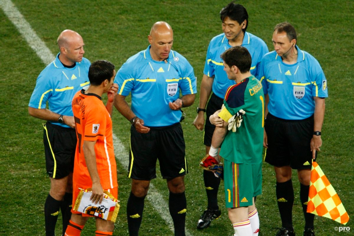 Het is de wedstrijd waar wij als Nederlandse voetbalfans het liefst niet aan herinnerd worden, de WK finale van 2010 tegen Spanje. In de biografie van scheidsrechter Howard Webb komt het duel echter aan bod, en daarmee ontkomen we er niet aan. Ook hij kijkt met afgrijzen terug op die avond in juli 2010.De arbiter van het duel beschrijft de finale als een nachtmerrie. Wat een van zijn mooiste wedstrijden ooit had moeten worden eindigde in een ramp: "Na twee minuten was er al een heel stevige tackle van Robin van Persie op Sergio Busquets", schrijft Webb in zijn boek. "Ik sprak hem erop aan. Ik kende hem wel uit zijn Arsenal-tijd en vond hem een oprechte jongen waar je makkelijk mee om kon gaan. Maar die avond was zijn houding duidelijk anders. Er kwam geen excuus of erkenning, hij was afwezig. O jee, werk aan de winkel, dacht ik."Uiteraard komt ook de karatetrap van Nigel de Jong aan bod, die Webb ontging en wat hem op veel kritiek kwam te staan: "Ik stond een kleine 10 meter achter Alonso, dus ik zag niet precies hoe De Jong hem had geraakt. Volgens mij was hij te laat en was het een roekeloze tackle. Ik besloot tot een gele kaart. Niemand van mijn team sprak mij in mijn oortje tegen.""Met mijn hand op mijn hart: een rode kaart is nooit bij mij opgekomen. Ik was op dat moment overtuigd van geel en niet geïntimideerd of onder druk gezet door de FIFA. Toen de Spanjaarden furieus reageerden, dacht ik dat het was omdat ik geen voordeel had gegeven. In de rust hoorde de scheids dat hij ernaast zat. "Ik was volkomen ontdaan. Het leek erop dat ik een rode kaart had gemist in een WK-finale. Wat een verschrikkelijke nachtmerrie."Na rust werd het zeker niet beter: "De tackles bleven vliegen en ik bleef maar gele kaarten uitdelen." De rode kaart die hij aan Heitinga gaf in de verlenging brak hem bijna: "Op dat moment begon ik te wankelen, zowel emotioneel als fysiek. Ik was uitgeput. Ik had nog nooit zo'n wedstrijd meegemaakt."Onder luid boegeroep ontving Webb een medaille van Sepp Blatter. Met een diner met zijn assistenten kwam er een einde aan één van de verschrikkelijkste avonden uit zijn leven.