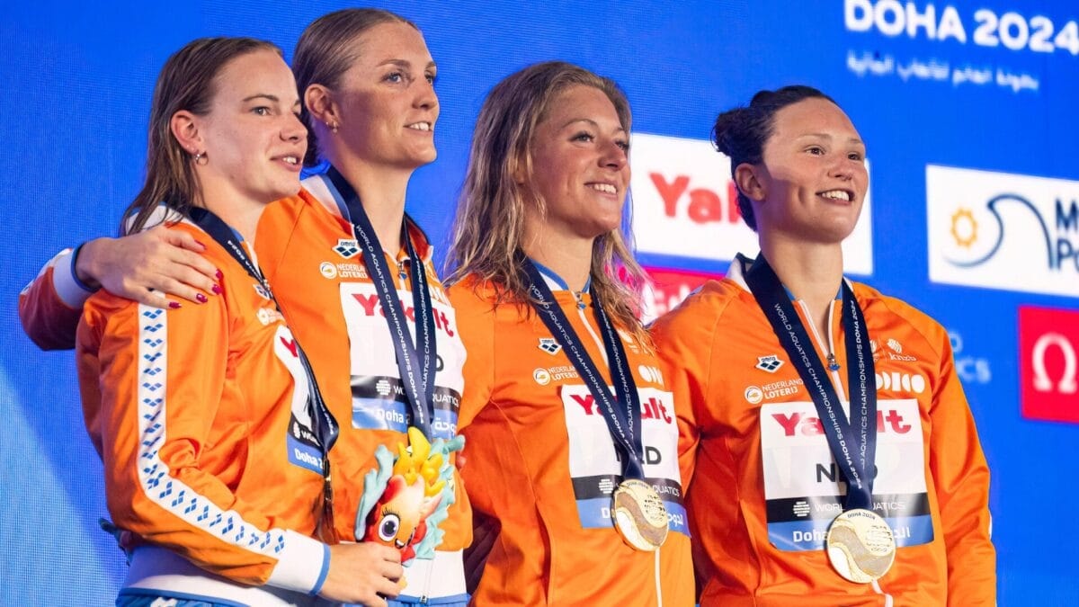 De Nederlandse estafettezwemsters hebben op het WK in Doha verrassend goud gepakt op de 4x100 meter vrije slag. Kim Busch, Janna van Kooten, Kira Toussaint en Marrit Steenbergen wisten uiteindelijk net voor Australië en Canada aan te tikken. Met een sterke eindsprint loodste Steenbergen de Nederlandse ploeg naar de wereldtitel.