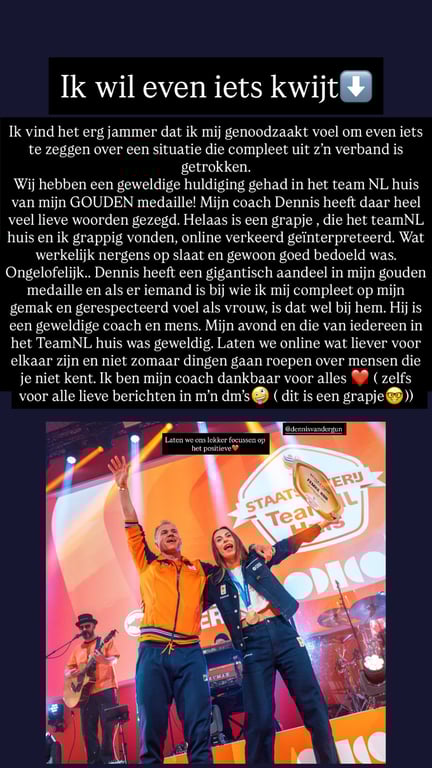 Kok kan zich niet vinden in de negatieve geluiden die de ronde doen. “Mijn coach Dennis heeft daar heel veel lieve woorden gezegd. Helaas is een grapje, die het TeamNL Huis en ik grappig vonden, online verkeerd geïnterpreteerd. Wat werkelijk nergens op slaat en gewoon goed bedoeld was. Ongelooflijk...”