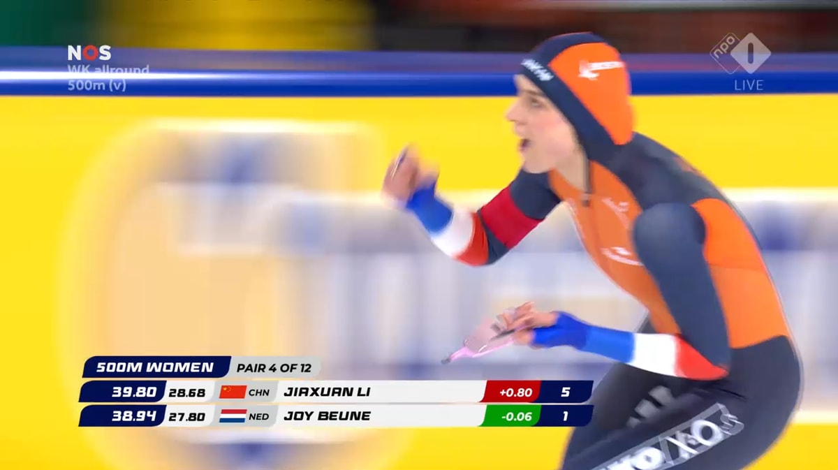Joy Beune gaat geweldig van start! Ze begint het toernooi met 38,94, op dit moment de beste tijd. Ze is er zichtbaar blij mee en dat mag ook. Het is haar tweede snelste 500 meter ooit.