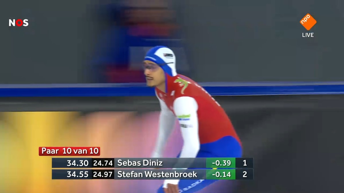 Met een ijzersterke tijd van 34,30 op de 500 meter begon Sebas Diniz goed aan zijn sprinttoernooi. Door de rappe tijden van Tim Prins (1.08,08), Botman (1.08,48) en Merijn Scheperkamp (1.08,57) op de 1.000 meter zal de slotdag van het sprinttoernooi bij de mannen zeer spannend worden. Het verschil tussen de top vier op de 500 meter van zondag is maar een kwart van een seconde.